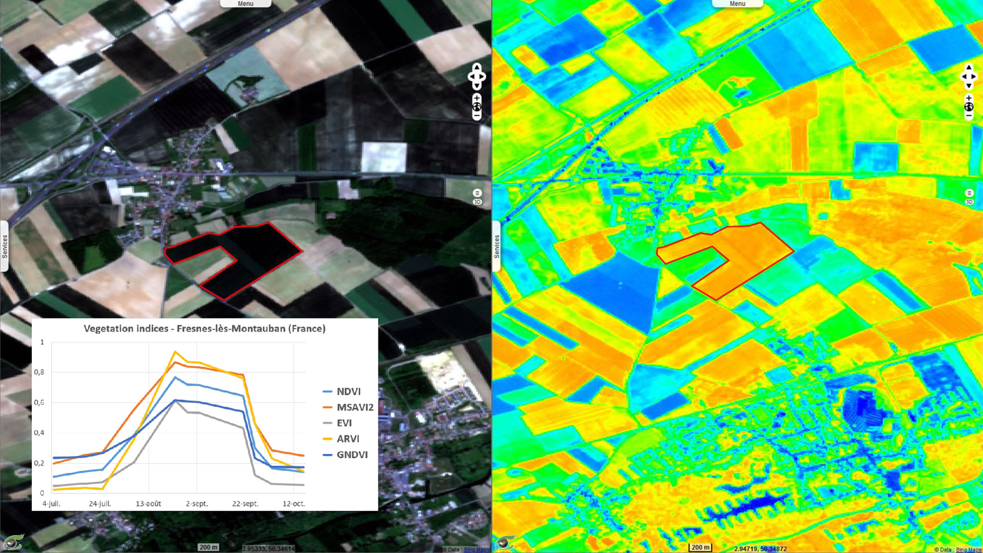 Geoservices provide users with synthetic information on the status of one or more indicators in a study area. Geoservices drive recurrent monitoring on user-defined areas of interest (zones to be monitored) by calculating one or more indicators each time the satellites fly over the area. Dashboards describe the evolution over time of the indicators (spatial aggregation graph) or the distribution of the values of an indicator in the study area (temporal aggregation map).